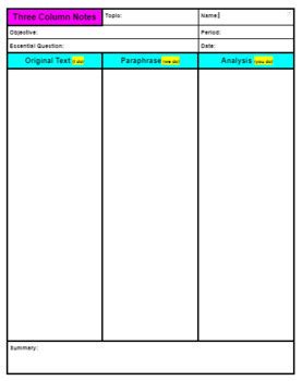 Learn how to use three column note taking to record, paraphrase and analyze ideas from your reading or lectures. Your own notes (taken any way you. See examples, adaptations and evaluation tips for.